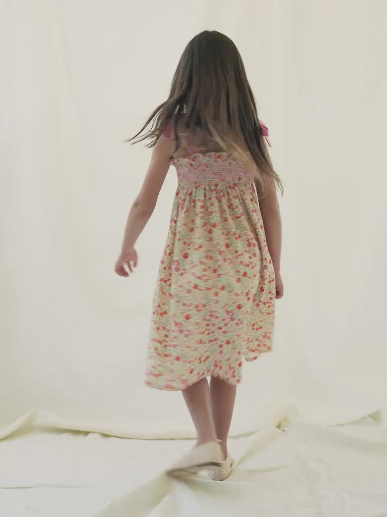 Lovely Eleanor dress in elegant sleeveless silhouette features a smocked top with ties on shoulders with lovely pink straps and a spacious, elegant skirt. Crafted from the softest 100% cotton in a floral meadow motif print. Truly beyond beautiful dress for the spring/summer season ahead.