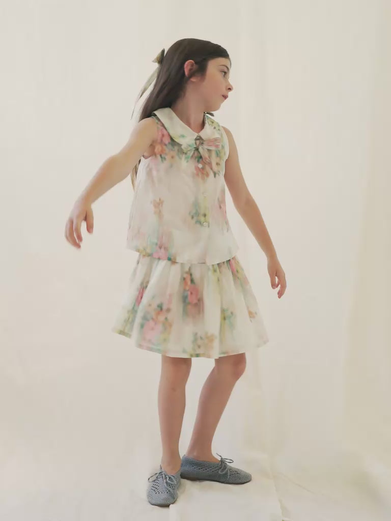 Adorable vintage-inspired Paris top in charming watercolor print with lovely oversized collar and bow. Features a comfortable, loose fit and front opening with mother-of-pearl buttons. Lovely match with the Paris skirt.