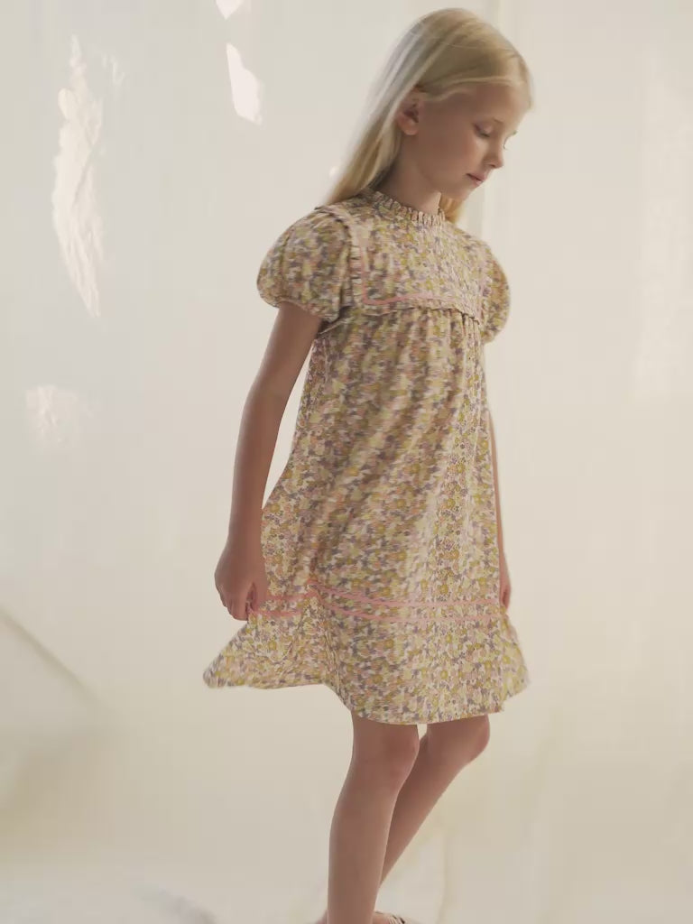 Inspired by vintage childhood memories. The nostalgic floral print Victoria dress is a heritage style that we are so proud to present this new season. Crafted from the softest cotton and trimmed with signature gentle pink zig-zag tape. A truly beautiful silhouette with gentle ruffling at the chest and collar with short puff sleeves. Back closure with mother-of-pearl buttons.