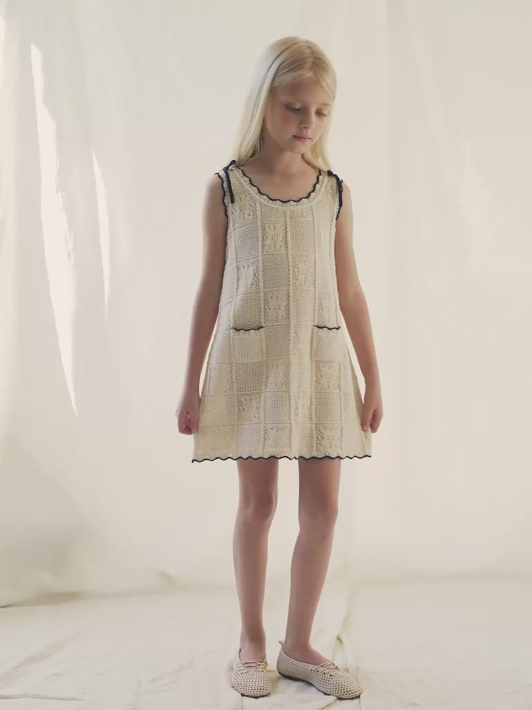 Knit of our dreams! Bebe Organic signature crochet style knitwear inspired by bohemian seaside holidays. Elina dress in crochet knit with lovely detailing made of 100% cotton yarn. Most adorable sleeveless dress features the cutest contrasting dark-blue lace detail on the neckline and hemline, with cute ties on the shoulders, and adorable little pockets on the front with contrasting lace. A lovely addition to your little one's spring/summer wardrobe.